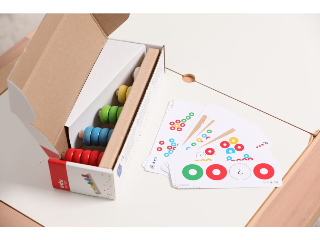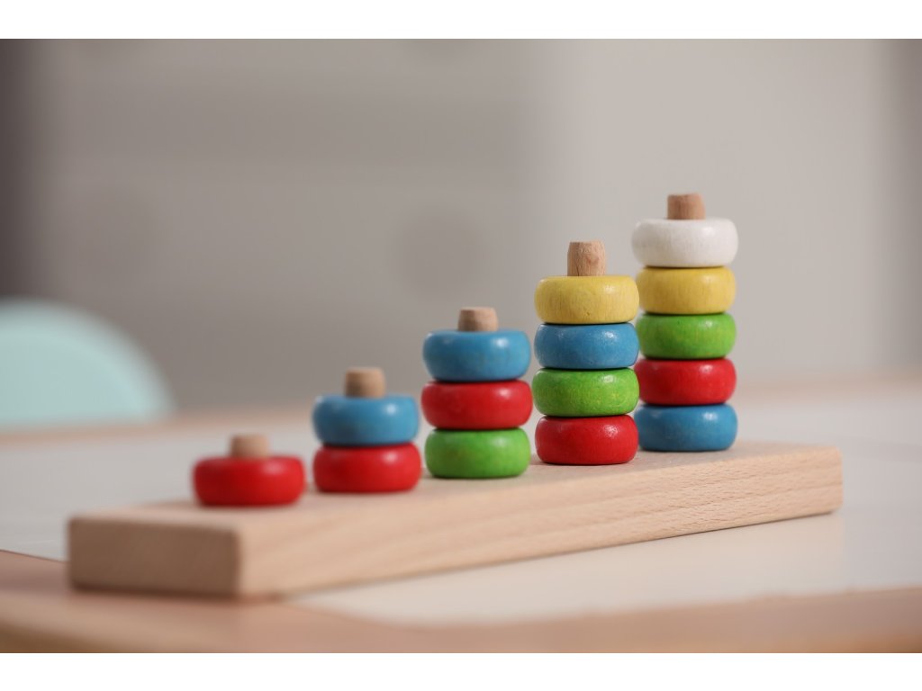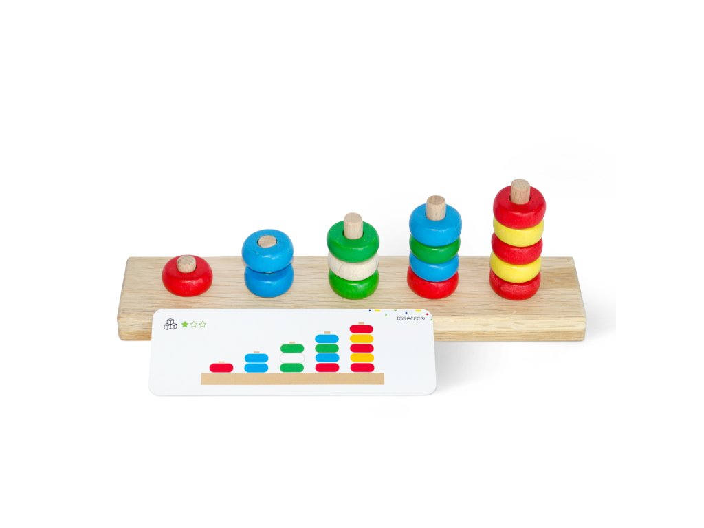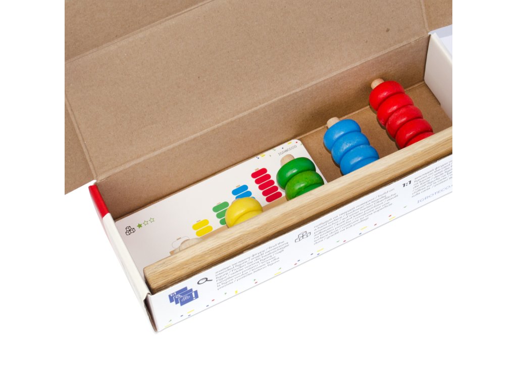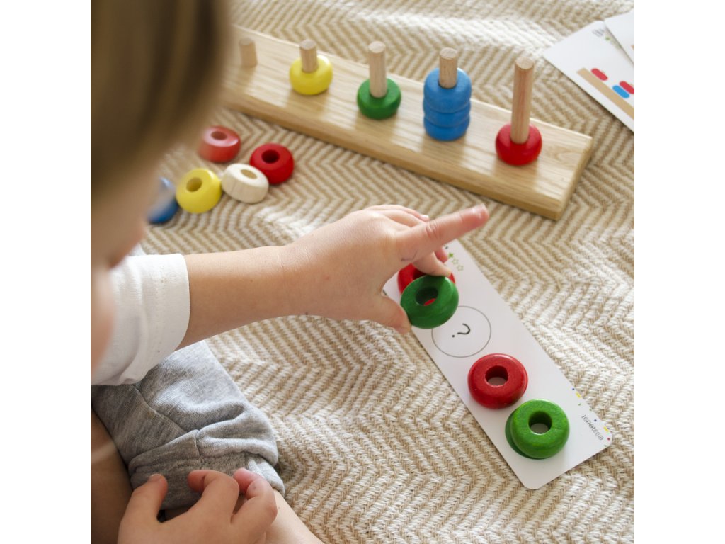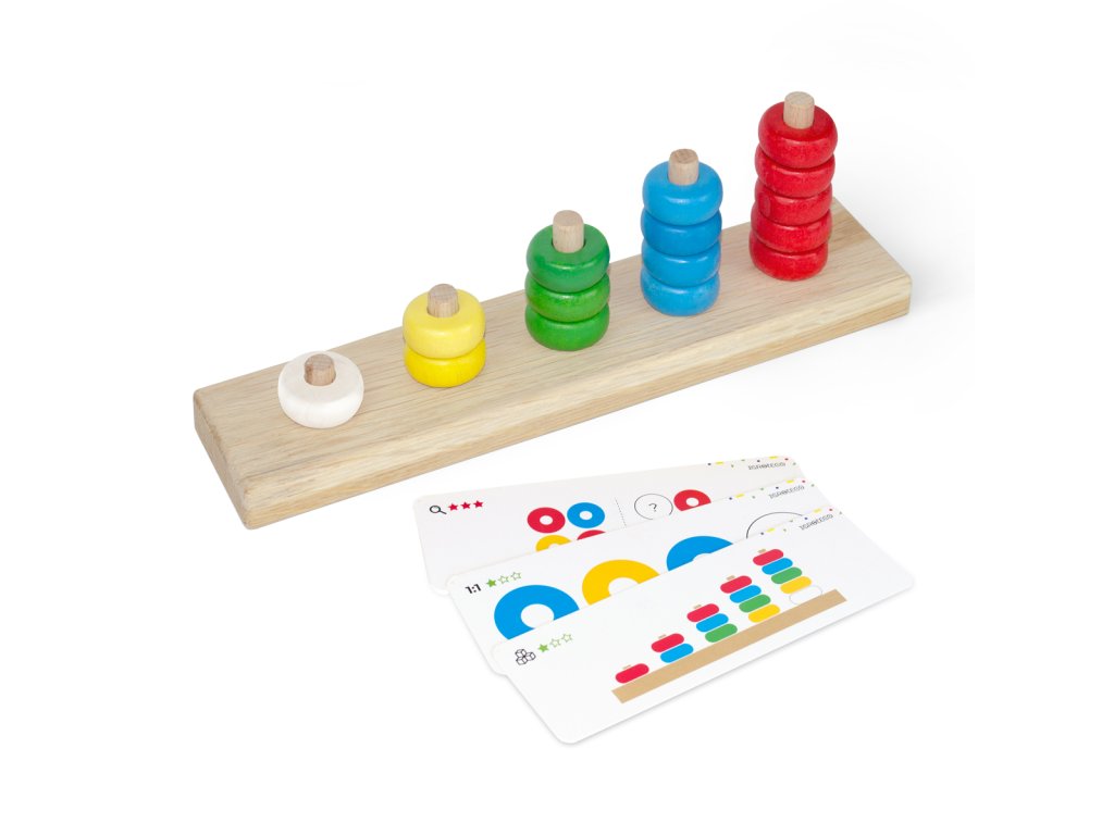 Hračka obsahuje 15 farebných drevených krúžkov rôznych farieb, ktoré sa navliekajú na 5 tyčiek rôznej výšky – od 1 do 5. Deti sa tak učia rozlišovať množstvo, farby, veľkosti a základy počítania až do 15. Unikátnym bonusom sú 10 obojstranných kartičiek s úlohami, ktoré trénujú logiku, sústredenie a fantáziu.