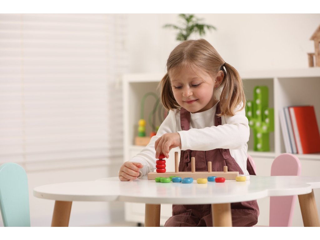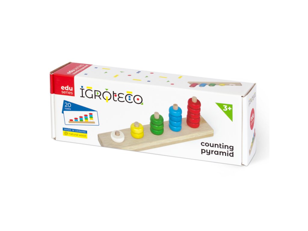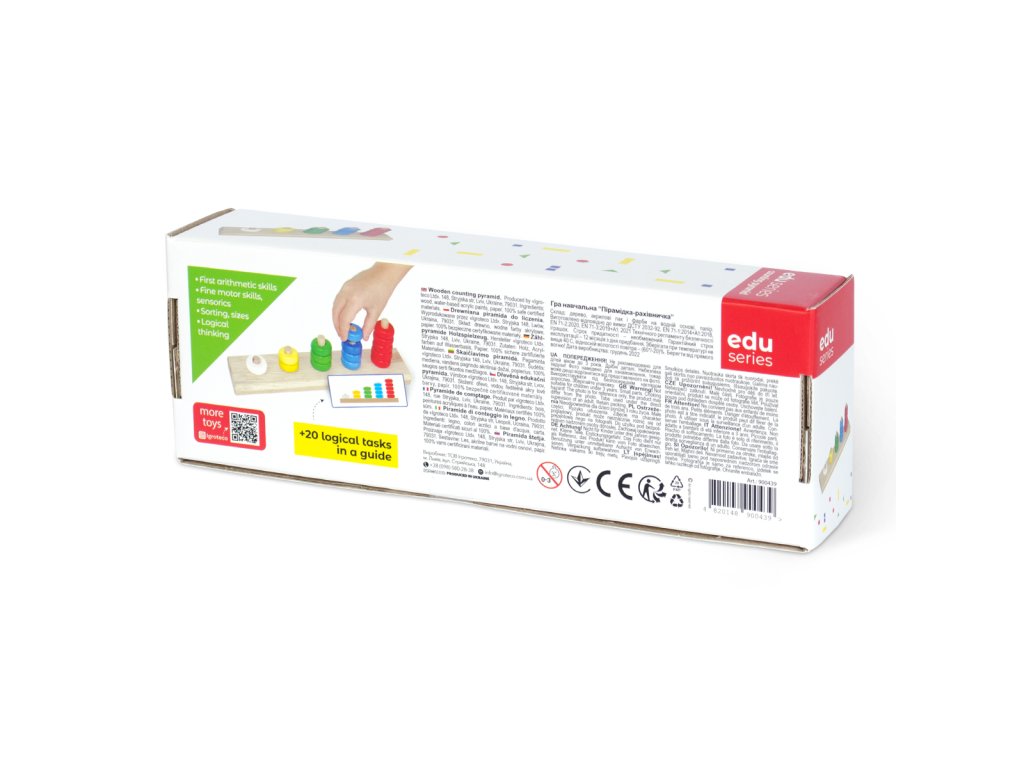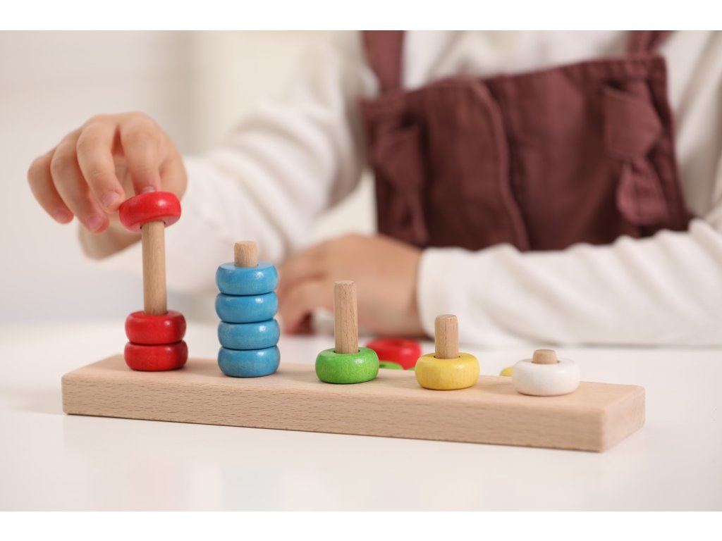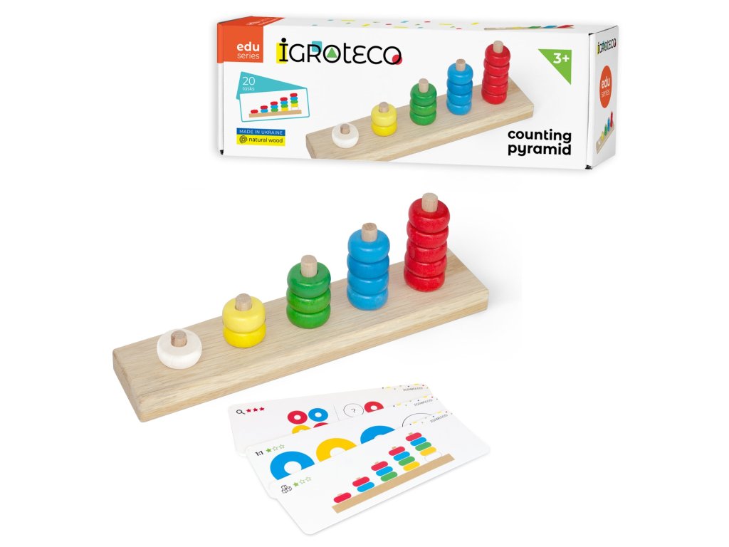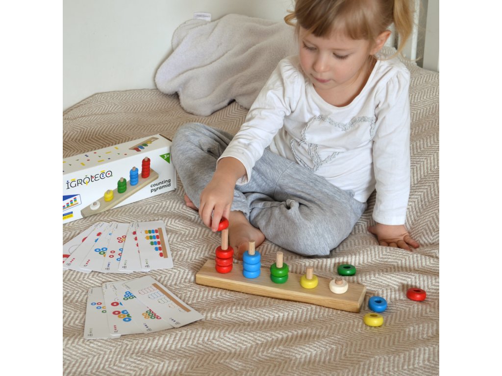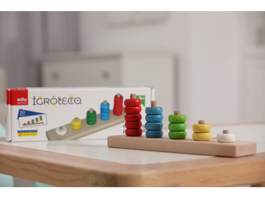 Hračka obsahuje 15 farebných drevených krúžkov rôznych farieb, ktoré sa navliekajú na 5 tyčiek rôznej výšky – od 1 do 5. Deti sa tak učia rozlišovať množstvo, farby, veľkosti a základy počítania až do 15. Unikátnym bonusom sú 10 obojstranných kartičiek s úlohami, ktoré trénujú logiku, sústredenie a fantáziu.